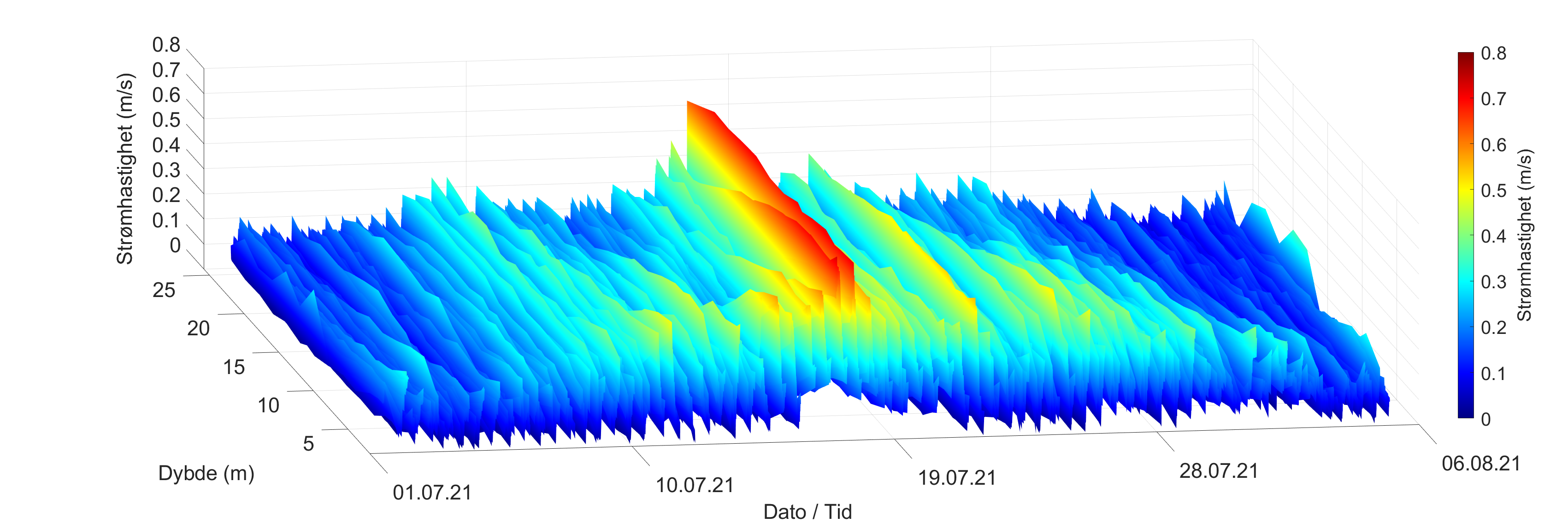 Variasjon i målt strømhastighet i vannsøylen i løpet av en måleperiode. Dato er indikert på x-aksen, dyp på y-aksen og strømhastighet på z-aksen samt med fargeskala.