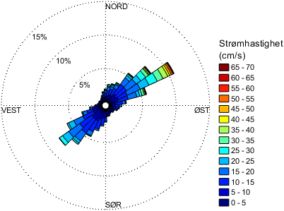 Strømrose: Prosentvis fordeling av målt strømhastighet, fordelt i 10°-retningssektorer. Målt strømhastighet er fordelt i ulike intervaller, indikert med fargeskala.